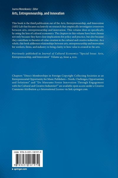 This book is the third publication out of the Arts, Entrepreneurship, and Innovation (AEI) Lab that focuses exclusively on research that empirically investigates crossovers between arts, entrepreneurship and innovation. This volume does so specifically by using the lens of cultural economics. The chapters in this volume have been chosen not only because they have clear implications for policy and practice, but also because they contribute to theories of value creation in the cultural and creative industries. As a whole, this book addresses relationships between arts, entrepreneurship and innovation for workers, firms, and industry to bring clarity to how value is created in the arts.