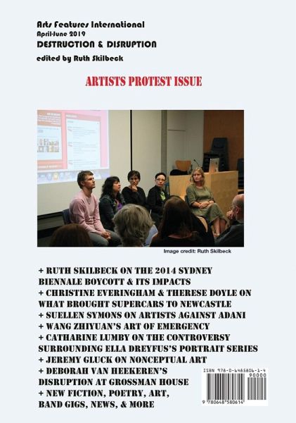 Photojournalist artists feature in the Destruction & Disruption 'artists protest issue' of Arts Features International published before the 2019 election in Australia, which documents that time of social activism by artists and local communities opposed to destruction of the natural and built environment and gentrification by acts of government and big business. And for increasing ways of community healing, engagement, and collaboration through art and generosity. Featured are pieces on local opposition to Destination NSW's approved Supercars motor race in Newcastle, by Dr Christine Everingham, Therese Doyle, and Newcastle East Residents Group. The Big Rev Up Benefit Auction of artworks for the Stop Adani coal mine Protest; Bob Brown's Stop Adani speech, and the residents' opposition to displacement and redevelopment of their homes in Sydney's inner-city Waterloo, Redfern and Alexandria, documented by Suellen Symons. The 'First Artists Announcement' of NIRIN the 22nd Biennale of Sydney, with a healing ceremony at Cell Block Theatre at the National Art School. The (successful) artists boycott of an earlier Sydney Biennale in protest at the contract award to the Board chairman's company (a Biennale sponsor) to profit from refugee detention camps. Works by Wang Zhiyuan. Exhibitions: Suellen Symons' Strange Paradise (Redfern Then and Now). Dr Ella Dreyfus's Under Twenty-Seven and essay by Professor Catharine Lumby. Dr Deborah van Heekeren's Disruption. A review by Silvia Pease. Jeremy Gluck's manifesto and his collaborations with Don Tyler, and Rosemary Osbourne. Artworks by Natasha Williams, and Luciano Prisco. A play by Vee Malnar. Writings and photographs by Ruth Skilbeck.