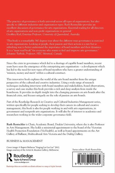 Since the crisis in governance which led to a shortage of capable board members, recent years have seen the emergence of the enterprising arts organisation - a development which has led to the need for new types of board members who have a greater understanding of 'mission, money and merit' within a cultural construct. This innovative book explores the world of the arts board member from the unique perspective of the cultural and creative industries. Using a wide range of research techniques including interviews with board members and stakeholders, board observations and case studies this book provides a rich and deep analysis from inside the boardroom. It provides in-depth insight into the changing pressures on arts boards after the financial crisis, and focuses uniquely on the role of passion on arts boards. Part of the Routledge Research in Creative and Cultural Industries Management series, written specifically for people seeking to develop their careers in cultural and creative management, this book is also for people working in and with arts organisations, in government and non-profit arts organisations. It will also be of interest to academics and researchers working in the wider corporate governance field.