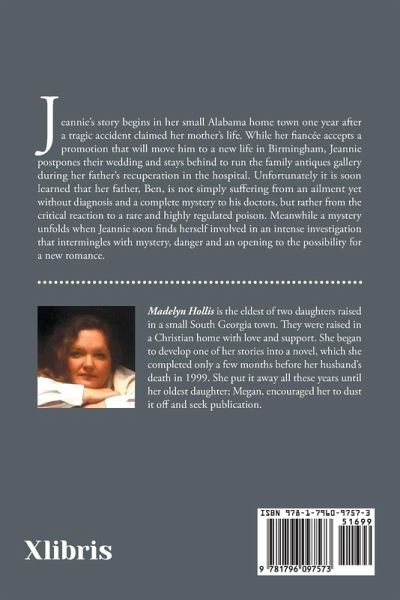 Jeannie's story begins in her small Alabama home town one year after a tragic accident claimed her mother's life. While her fiancée accepts a promotion that will move him to a new life in Birmingham, Jeannie postpones their wedding and stays behind to run the family antiques gallery during her father's recuperation in the hospital. Unfortunately it is soon learned that her father, Ben, is not simply suffering from an ailment yet without diagnosis and a complete mystery to his doctors, but rather from the critical reaction to a rare and highly regulated poison. Meanwhile a mystery unfolds when…mehr