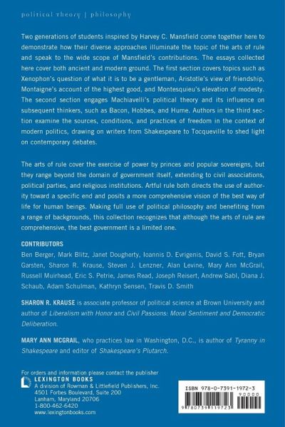 Two generations of students inspired by Harvey Mansfield come together here to demonstrate how their diverse approaches illuminate the topic of the arts of rule and speak to the wide scope of Mansfield's contributions. The essays collected here cover both ancient and modern ground. The first section covers topics such as Xenophon's question of what it is to be a gentleman, Aristotle's view of friendship, Montaigne's account of the highest good, and Montesquieu's elevation of modesty. The second section engages Machiavelli's political theory and its influence on subsequent thinkers, such as Bacon, Hobbes, and Hume. Authors in the third section examine the sources, conditions, and practices of freedom in the context of modern politics, drawing on writers from Shakespeare to Tocqueville to shed light on contemporary debates. The arts of rule cover the exercise of power by princes and popular sovereigns, but they range beyond the domain of government itself, extending to civil associations, political parties, and religious institutions. Artful rule both directs the use of authority toward a specific end and posits a more comprehensive vision of the best way of life for human beings. Making full use of political philosophy and benefiting from a range of backgrounds, this collection recognizes that although the arts of rule are comprehensive, the best government is a limited one.