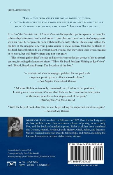 These essays trace a distinguished writer's engagement with her time, her arguments with herself and others. "I am a poet who knows the social power of poetry, a United States citizen who knows herself irrevocably tangled in her society's hopes, arrogance, and despair," Adrienne Rich writes. The essays in Arts of the Possible search for possibilities beyond a compromised, degraded system, seeking to imagine something else. They call on the fluidity of the imagination, from poetic vision to social justice, from the badlands of political demoralization to an art that might wound, that may open scars when engaged in its work, but will finally suture and not tear apart. This volume collects Rich's essays from the last decade of the twentieth century, including four earlier essays, as well as several conversations that go further than the usual interview. Also included is her essay explaining her reasons for declining the National Medal for the Arts. "The work is inspired and inspiring."-Alicia Ostriker "[S]o clear and clean and thorough. I learn from her again and again."-Grace Paley