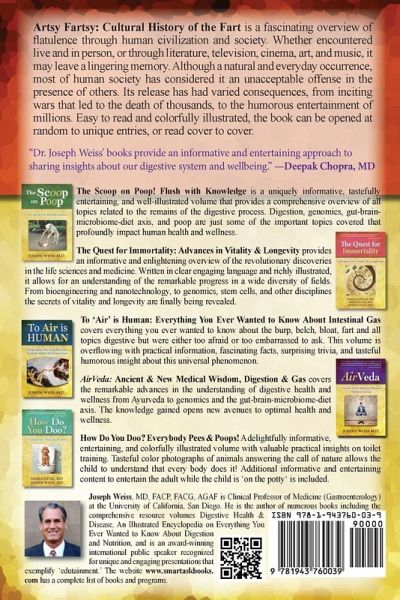 Artsy Fartsy, Cultural History of the Fart is a fascinating and factual overview of the common fart through human culture and history. The cough, sneeze, hiccup, stomach rumble, burp, belch, and other bodily sounds simply cannot compete with the notoriety of the fart. Whether encountered live and in person or through the medium of literature, television, cinema, art, or music it may leave a powerful and lingering memory. The history of the fart in culture and society is a seldom told but remarkable tale. In spite of it being a natural and everyday occurrence, most of human society has considered it to be beyond the bounds of acceptable behavior in the presence of others. The suppression of a normal physiologic necessity, and it being banished from proper society, has made the fart a notorious sensation. Its release has had powerful consequences, from the unexpected triggering of wars that led to the death of thousands of innocents, to the opposite extreme of inducing spasms of laughter with the entertainment of millions. Easy to read and colorfully illustrated, the book can be opened at random to unique entries, or read cover to cover. The knowledge gained will make the reader a fountain of cultural information that will be sure to leave an impression on others. A compendium of euphemisms of how to describe a fart without uttering the forbidden word, as well its translation in foreign languages, is also included. Additional famous quotations of the noted historical and cultural figures are incorporated to balance their reference to the lowly, but all-powerful, fart.