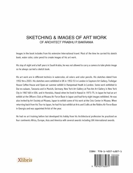 Images in the book includes from his extensive International travel. Most of the time he carried his sketch book, water color, color pencil to create images of his art work. His stay of eight and a half years in Saudi Arabia, he was not allowed to carry a camera to take photo image so he always carried a sketch book. His art work are in different technics in watercolor, oil colors and color pencils. His sketches dated from 1952 thru 2003. His sketches were exhibited in UK in 1952-53 in London in Saymore Art Gallary, Trafalgar House Coffee House and Open-air summer exhibit in Hampstead Heath in London. Some work exhibited in Dar-es-salaam, Tanzania and in Munich, Germany. New York Art Gallery at Pan-Am Art Gallery in New York City in 1967-68 in USA. and in Honolulu, Hawaii when he lived in Hawaii in 1973-75. In Japan he had an art exhibit at the Officers Club at Misawa Air Force Base in Japan and had forty eight images exhibited. He was also invited by Art Society at Misawa, Japan to exhibit some of his work at the Civic Center in Misawa. When returning back from his Tour to Japan, he had his last exhibit at Arts and Crafts at the Robins Air Force Base in Georgia and was appointed Artist of the year. He had no art training before but developed his hobby from his Architectural profession he practiced on four continents Africa, Europe, Asia and America with several awards including UIA International awards.