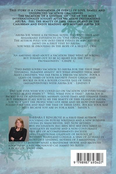 Aruba Vacation with Aruba Joe written by first-time author Barbara E Ringrose is a fictional romance comedy of much humor and bizarre experiences based on a blended family 'vacation of a lifetime'. Travel to the small Caribbean 'one happy island' of Aruba is the perfect way for Aruba Joe to express his affections and show off the island to win the hearts of both the woman of his dreams AND her children. Although, there seems to be a bit of a problem on this internationally sought after island destination. Every time Aruba Joe plans or does something, it goes awry. From the first time he met Alex, he knew he had deep affection toward her, then lost her, and kept thinking of her for many years in hopes of much more. The 10 day adventure ends up with another chaos. He is given one more opportunity to make his dream come true as he tells the tale to some very special people-her long time gal-pal and her husband. During this amusing virtual read of their experiences, you will feel the beauty of this small island and meet Aruba Joe!