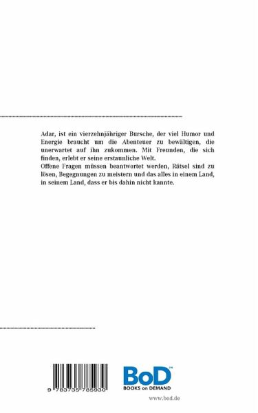 Adar, ist ein vierzehnjähriger Bursche, der viel Humor und Energie braucht um die Abenteuer zu bewältigen, die unerwartet auf ihn zukommen. Mit Freunden, die sich finden, erlebt er seine erstaunliche Welt.Offene Fragen müssen beantwortet werden, Rätsel sind zu lösen, Begegnungen zu meistern und das alles in einem Land, in seinem Land, dass er bis dahin nicht kannte.