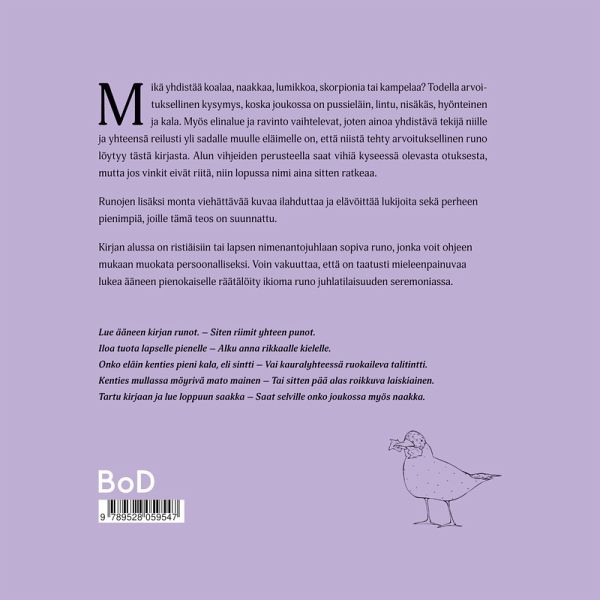 Arvoituksellisia eläinrunoja teos sisältää ilahduttavia riimiteltyjä runoja yli sadasta eri otuksesta. Mukaan ovat päässyt lukuisa joukko kotimaamme villi- sekä kotieläimiä. Onpa seassa myös mukana muutama Afrikan tai Australian eläjä. Teos on tarkoitettu luettavaksi vaikkapa iltasatujen muodossa alle kouluikäisille lapsille rikastuttamaan heidän kielellistä varhaiskehitystään. Kirjan alussa on kasteruno ja ohje, kuinka voit räätälöidä siitä omanlaisen perheen / suvun nuorta jäsentä koskevan. Runon voi lukea kaste- tai nimiäisjuhlan seremoniassa. Teos on siis samalla oiva lahja isovanhemmilta tai kummilta pienelle lapselle. Muutamia arvoituksellisia runoja elävöittävät myös upeat piirrokset.