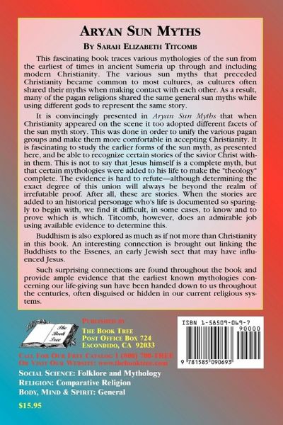 This fascinating book traces various mythologies of the sun from the earliest of times in ancient Sumeria up through and including modern Christianity. The various sun myths that preceded Christianity became common to most cultures, as cultures often shared their myths when making contact with each other. As a result, many of the pagan religions shared the same general sun myths while using different gods to represent the same story. It is convincingly presented in Aryan Sun Myths that when Christianity appeared on the scene it too adopted different facets of the sun myth story. This was done in order to unify the various pagan groups and make them more comfortable in accepting Christianity. It is fascinating to study the earlier forms of the sun myth, as presented here, and be able to recognize certain stories of the savior Christ within them. This is not to say that Jesus himself is a complete myth, but that certain mythologies were added to his life to make the "theology" complete. The evidence is hard to refute -- although determining the exact degree of this union will always be beyond the realm of irrefutable proof. After all, these are stories. When the stories are added to an historical personage who's life is documented so sparingly to begin with, we find it difficult, in some cases, to know and to prove which is which. Titcomb, however, does an admirable job using available evidence to determine this. Buddhism is also explored as much as if not more than Christianity in this book. An interesting connection is brought out linking the Buddhists to the Essenes, an early Jewish sect that may have influenced Jesus. Such surprising connections are found throughout the book andprovide ample evidence that the earliest known mythologies concerning our life-giving sun have been handed down to us throughout the centuries, often disguised or hidden in our current religious systems.