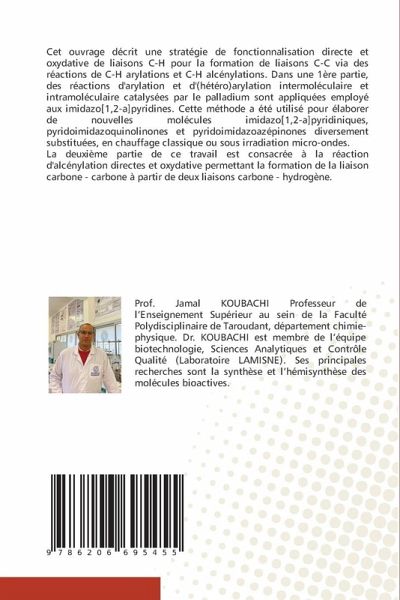 Cet ouvrage décrit une stratégie de fonctionnalisation directe et oxydative de liaisons C-H pour la formation de liaisons C-C via des réactions de C-H arylations et C-H alcénylations. Dans une 1ère partie, des réactions d'arylation et d'(hétéro)arylation intermoléculaire et intramoléculaire catalysées par le palladium sont appliquées employé aux imidazo[1,2-a]pyridines. Cette méthode a été utilisé pour élaborer de nouvelles molécules imidazo[1,2-a]pyridiniques, pyridoimidazoquinolinones et pyridoimidazoazépinones diversement substituées, en chauffage classique ou sous irradiation micro-ondes.La deuxième partie de ce travail est consacrée à la réaction d'alcénylation directes et oxydative permettant la formation de la liaison carbone - carbone à partir de deux liaisons carbone - hydrogène.