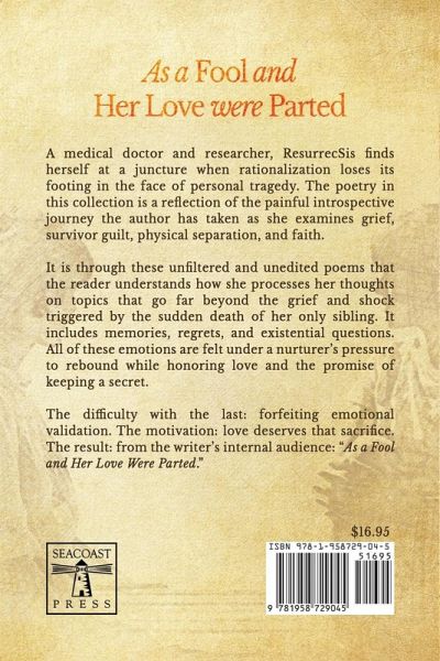 A medical doctor and researcher, ResurrecSis finds herself at a juncture when rationalization loses its footing in the face of personal tragedy. The poetry in this collection is a reflection of the painful introspective journey the author has taken as she examines grief, survivor guilt, physical separation, and faith. It is through these unfiltered and unedited poems that the reader understands how she processes her thoughts on topics that go far beyond the grief and shock triggered by the sudden death of her only sibling. It includes memories, regrets, and existential questions. All of these emotions are felt under a nurturer's pressure to rebound while honoring love and the promise of keeping a secret. The difficulty with the last: forfeiting emotional validation. The motivation: love deserves that sacrifice. The result: from the writer's internal audience: "As a Fool and Her Love Were Parted."