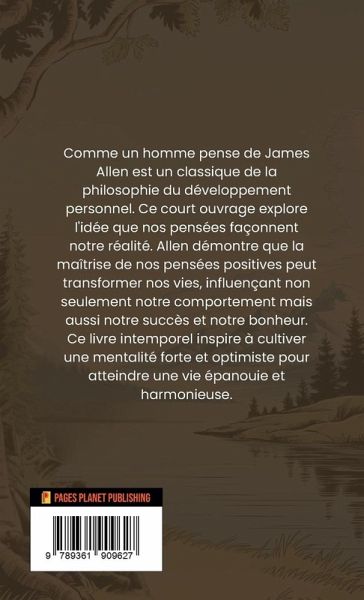 Comme un homme pense de James Allen est un classique de la philosophie du développement personnel. Ce court ouvrage explore l'idée que nos pensées façonnent notre réalité. Allen démontre que la maîtrise de nos pensées positives peut transformer nos vies, influençant non seulement notre comportement mais aussi notre succès et notre bonheur. Ce livre intemporel inspire à cultiver une mentalité forte et optimiste pour atteindre une vie épanouie et harmonieuse.