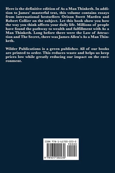 Here is the definitive edition of As a Man Thinketh. In addition to James' masterful text, this volume contains essays from international bestsellers Orison Swett Marden and Robert Collier on the subject. Let this book show you how the way you think affects your daily life. Millions of people have found the pathway to wealth and fulfillment with As a Man Thinketh. Long before there were the Law of Attraction and The Secret, there was James Allen's As a Man Thinketh. Wilder Publications is a green publisher. All of our books are printed to order. This reduces waste and helps us keep prices low while greatly reducing our impact on the environment.