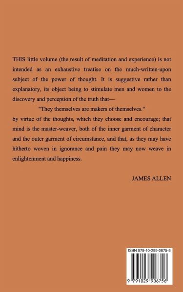THIS little volume (the result of meditation and experience) is not intended as an exhaustive treatise on the much-written-upon subject of the power of thought. It is suggestive rather than explanatory, its object being to stimulate men and women to the discovery and perception of the truth that— "They themselves are makers of themselves." by virtue of the thoughts, which they choose and encourage; that mind is the master-weaver, both of the inner garment of character and the outer garment of circumstance, and that, as they may have hitherto woven in ignorance and pain they may now weave in enlightenment and happiness. JAMES ALLEN.