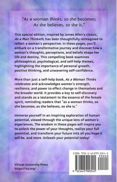 This special edition, inspired by James Allen's classic, As a Man Thinketh, has been thoughtfully reimagined to reflect a woman's perspective. In these pages, you'll embark on a transformative journey and discover how a woman's thoughts, perceptions, and beliefs shape her life and destiny. This compelling book examines philosophical, psychological, and self-help themes, highlighting the importance of personal growth, positive thinking, and unwavering self-confidence. More than just a self-help book, As a Woman Thinks celebrates and acknowledges women's strength, resilience, and power to effect change in themselves and the broader world. It provides a key to self-discovery and stands as a testament to the essence of the female spirit, reminding readers that "as a woman thinks, so she becomes; as she believes, so she is." Immerse yourself in an inspiring exploration of human potential, viewed through the unique lens of women's experiences. The wisdom in these pages will inspire you to unlock the power of your thoughts, realize your full potential, and transform your future into all you hope it will be, and more. Unleash your potential today! "As a woman thinks, so she becomes. As she believes, so she is."