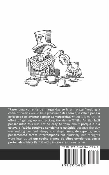 "Fazer uma corrente de margaridas seria um prazer" "making a chain of daisies would be a pleasure" "Mas será que vale a pena o esforço de se levantar e pegar as margaridas " "but is it worth the effort of getting up and picking the daisies " Não foi tão fácil pensar nisso this was not so easy to think about porque o dia estava a fazê-la sentir-se sonolenta e estúpida because the day was making her feel sleepy and stupid mas, de repente, seus pensamentos foram interrompidos but suddenly her thoughts were interrupted um coelho branco de olhos cor-de-rosa corria perto dela a White Rabbit with pink eyes ran close by her Não havia nada de muito notável no coelho There was nothing overly remarkable about the rabbit e Alice também não achava o coelho notável and Alice did not think the rabbit remarkable either nem a surpreendeu quando o Coelho falou nor did it surprise her when the Rabbit spoke "Oh querida! Vou chegar tarde demais!", disse a si mesmo "Oh dear! I shall be too late!" he said to himself mas depois o Coelho fez algo que os coelhos não fizeram but then the Rabbit did something that rabbits didn't do o Coelho tirou um relógio do bolso do colete the Rabbit took a watch out of its waistcoat-pocket Olhou para a hora e depois apressou-se he looked at the time and then hurried on