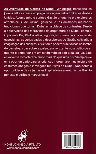 In As Aventuras do Gastão no Dubai 2.ª Edição, adventure whispers in the desert sands, beckoning a young explorer named Gastão. Pack your thirst for thrills because Dubai is about to unveil its magic! Gastão, a seasoned traveler despite his young age, exchanges cobblestone streets for sun-drenched beaches. Skyscrapers pierce the clouds like silver daggers while bustling souks tempt with treasures untold. The Burj Khalifa, the opulent giant, murmurs tales of ambition, while the sand holds ancient secrets beneath the hooves of camels. Join Gastão as he lays down camel tracks in the desert, floats like a cloud above the Palm Jumeirah's emerald crown, and feasts on stories under a star-dusted sky. But this isn't just a playground of escapades. Dubai hums with history; its spices carry echoes of bygone caravans, and its mosques resonate with ancient prayers. Gastão uncovers a symphony formed of tradition and modernity-a city where time dances to its own rhythm. As Aventuras do Gastão no Dubai 2.ª Edição isn't just a trip; it's a sensory delight. Let Gastão be your compass, guiding you through sun-soaked alleys and moonlit dunes to discover a city that glitters as much with soul as with gold. Fuel your sense of discovery and prepare to be swept away by Dubai's spell. Gastão awaits, and adventure never sleeps. PORTUGUESE SUMMARY ¿¿Nas Aventuras de Gastão no Dubai, 2.ª Edição, a aventura sussurra nas areias do deserto, chamando um jovem explorador chamado Gastão. Prepare-se para a sede de emoções, pois o Dubai está prestes a revelar a sua magia! O Gastão, um viajante experiente apesar dos seus tenros anos, troca as ruas de calçada por praias banhadas pelo sol. Os arranha-céus perfuram as nuvens como adagas de prata, enquanto os mercados movimentados seduzem com tesouros incontáveis. O Burj Khalifa, o opulento gigante, murmura contos de ambição, enquanto a areia guarda segredos antigos sob as patas dos camelos. Junte-se a Gastão enquanto ele traça trilhos de camelos no deserto, flutua como uma nuvem acima da coroa esmeralda de Palm Jumeirah e se delicia com histórias sob um céu estrelado. Mas este não é apenas um parque de diversões para aventuras. O Dubai ecoa com história; as suas especiarias carregam ecos de caravanas de outrora, e as suas mesquitas ressoam com orações antigas. O Gastão descobre uma sinfonia formada pela tradição e modernidade - uma cidade onde o tempo dança ao seu próprio ritmo.