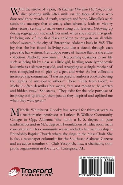 With the stroke of a pen, As Blessings Flow Into This Life, comes alive painting smile after smile on the faces of those who dare read these words of truth, strength and hope. Michelle's work sends the message that adversity leads to victory serving to make one strong and fearless. Growing up during segregation, she made her mark when she entered first grade by being one of the first black children to integrate an all white school system in the city of Enterprise, Alabama back in1965. Michelle proclaims, " Overcoming obstacles in my life such as being hit by a car as a little girl and battling acute lymphocytic leukemia as a sixteen year old compelled me to pick up a pen and write. Her unique sense of humor flavors the entire collection. As her collection increased she comments, "I was inspired to author a book, releasing the depths of my soul to others." These "Gifts from God", as Michelle often describes her words, "are not meant to be written and hidden away." She states, "They exist for the sole purpose of inspiring and uplifting others just as they inspired and uplifted me when they were given."