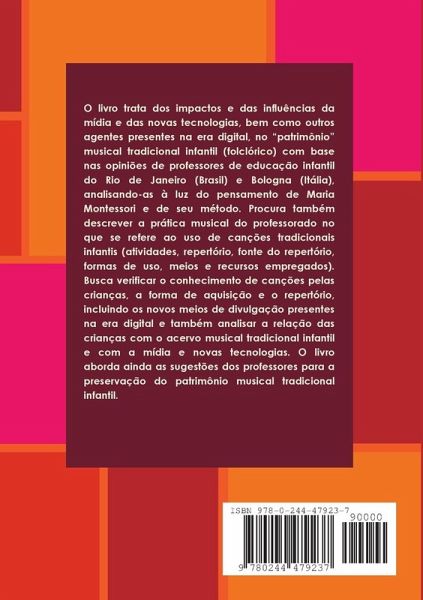 O livro trata das variáveis, dos impactos e das influências da mídia e das novas tecnologias, bem como outros agentes presentes na era digital, no "patrimônio" musical infantil tradicional (folclórico) com base na opinião de professores de educação infantil do Rio de Janeiro (Brasil) e Bologna (Itália), analisando-as à luz do pensamento de Maria Montessori e seu método. Procura também descrever a prática musical do professorado no que se refere ao uso de canções infantis folclóricas tradicionais (atividades, repertório, fonte do repertório, formas de uso, meios e recursos empregados - tradicionais ou incluídos no campo das novas tecnologias.