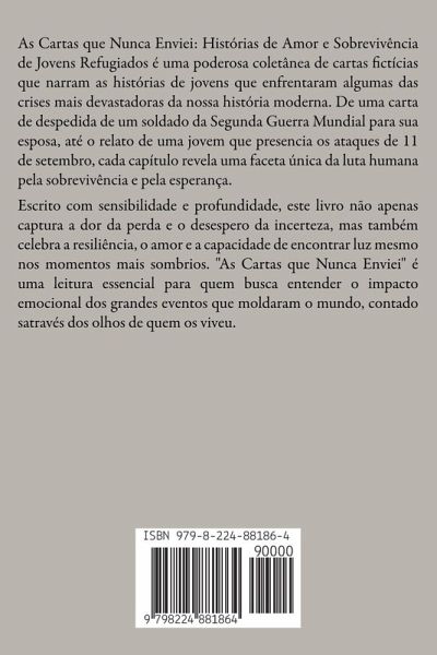 As Cartas que Nunca Enviei: Histórias de Amor e Sobrevivência de Jovens Refugiados é uma poderosa coletânea de cartas fictícias que narram as histórias de jovens que enfrentaram algumas das crises mais devastadoras da nossa história moderna. De uma carta de despedida de um soldado da Segunda Guerra Mundial para sua esposa, até o relato de uma jovem que presencia os ataques de 11 de setembro, cada capítulo revela uma faceta única da luta humana pela sobrevivência e pela esperança. Escrito com sensibilidade e profundidade, este livro não apenas captura a dor da perda e o desespero da incerteza, mas também celebra a resiliência, o amor e a capacidade de encontrar luz mesmo nos momentos mais sombrios. "As Cartas que Nunca Enviei" é uma leitura essencial para quem busca entender o impacto emocional dos grandes eventos que moldaram o mundo, contado satravés dos olhos de quem os viveu.