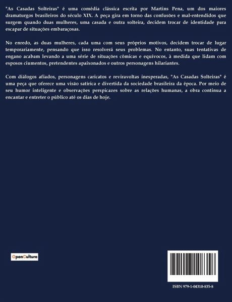 "As Casadas Solteiras" é uma comédia clássica escrita por Martins Pena, um dos maiores dramaturgos brasileiros do século XIX. A peça gira em torno das confusões e mal-entendidos que surgem quando duas mulheres, uma casada e outra solteira, decidem trocar de identidade para escapar de situações embaraçosas. No enredo, as duas mulheres, cada uma com seus próprios motivos, decidem trocar de lugar temporariamente, pensando que isso resolverá seus problemas. No entanto, suas tentativas de engano acabam levando a uma série de situações cômicas e equívocos, à medida que lidam com esposos ciumentos, pretendentes apaixonados e outros personagens hilariantes. Com diálogos afiados, personagens caricatos e reviravoltas inesperadas, "As Casadas Solteiras" é uma peça que oferece uma visão satírica e divertida da sociedade brasileira da época. Por meio de seu humor inteligente e observações perspicazes sobre as relações humanas, a obra continua a encantar e entreter o público até os dias de hoje.