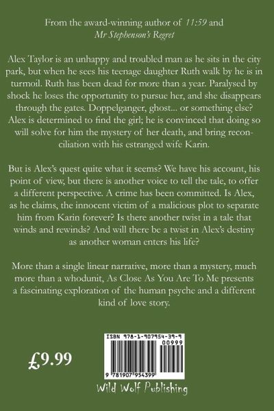 Alex Taylor is an unhappy and troubled man as he sits in the city park, but when he sees his teenage daughter Ruth walk by he is in turmoil. Ruth has been dead for more than a year. Paralysed by shock he loses the opportunity to pursue her, and she disappears through the gates. Doppelganger, ghost... or something else? Alex is determined to find the girl; he is convinced that doing so will solve for him the mystery of her death, and bring reconciliation with his estranged wife Karin. But is Alex's quest quite what it seems? We have his account, his point of view, but there is another voice to tell the tale, to offer a different perspective. A crime has been committed. Is Alex, as he claims, the innocent victim of a malicious plot to separate him from Karin forever? Is there another twist in a tale that winds and rewinds? And will there be a twist in Alex's destiny as another woman enters his life? More than a single linear narrative, more than a mystery, much more than a whodunit, As Close As You Are To Me presents a fascinating exploration of the human psyche and a different kind of love story.