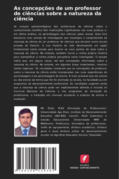 As crenças epistemológicas dos professores de ciências sobre o conhecimento científico têm implicações significativas nas suas práticas e, em última análise, na aprendizagem das ciências pelos alunos. Este livro baseia-se num estudo de investigação que investigou a compreensão da natureza da ciência de um professor de ciências que lecciona numa escola privada de Karachi. A sua história de vida desempenha um papel fundamental neste estudo para ilustrar os seus pontos de vista sobre a natureza da ciência. No entanto, também narrei a minha própria história para exemplificar a minha própria perspetiva como investigador. O estudo indica que, em alguns casos, ele tem concepções informadas sobre a natureza da ciência. No entanto, em algumas áreas importantes, mostrou visões ingénuas. Os resultados revelaram que as concepções do professor sobre a natureza da ciência estão incorporadas nas suas experiências de aprendizagem e de aprendizagem do ensino. É mais provável que ele ensine ou não ensine da forma que lhe foi ensinada na escola, na faculdade ou em programas de desenvolvimento profissional. Os resultados sugerem ainda que a natureza da ciência pode ser explicitamente definida e incluída no Currículo Nacional de Ciências e nos programas de formação de professores, e traduzida em manuais escolares e práticas de ensino e avaliação.