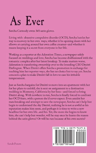 Sorcha Carmody owns 365 satin gloves. Living with contamination focused obsessive compulsive disorder (OCD), Sorcha battles her way to recovery in her own ways, whether it be opening doors with her elbows or carrying around her own coffee creamer--and whether it means keeping it a secret from everyone in her life. Working as a reporter at the Adoration Times, a newspaper solely focused on weddings and love, Sorcha has become disillusioned with the romantic complex after her latest breakup. To make matters worse, Adoration is transferring ownership over to the brooding CEO Dmitri Darlington. When Dmitri offers Sorcha a promotion in exchange for teaching him her reporter ways, she has no choice but to say yes. Sorcha concocts a plan to make Dmitri fall in love to ease his irritable temperament. Just as Sorcha bargains for Dmitri to move into an apartment with her for her plans to unfold, she is sent on assignment to a destination wedding in Monterey, California by her boss---and forced to bring Dmitri along. With nowhere to run, Sorcha is finally forced to confront her OCD fears...with a person she'd never expect. Even amidst her matchmaking and attempt to save the newspaper, Sorcha can't help but begin to understand the shy Dmitri, realizing he is not as awful as his reputation makes him seem, and perhaps it is time to write a new headline for her own life...and his. Yet, the more she begins to know him, she can't help but wonder, will he stay once he learns the reason behind the satin gloves? Or will he run because of his own secrets?