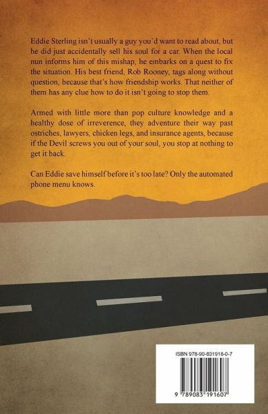 Eddie Sterling isn't usually a guy you'd want to read about, but he did just accidentally sell his soul for a car. When the local nun informs him of this mishap, he embarks on a quest to fix the situation. His best friend, Rob Rooney, tags along without question, because that's how friendship works. That neither of them has any clue how to do it isn't going to stop them. Armed with little more than pop culture knowledge and a healthy dose of irreverence, they adventure their way past ostriches, lawyers, chicken legs, and insurance agents, because if the Devil screws you out of your soul, you stop at nothing to get it back. Can Eddie save himself before it's too late? Only the automated phone menu knows.