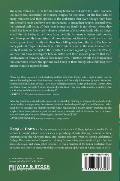 The verse, Joshua 24:15, ""as for me and my house we will serve the Lord,"" has been the desire and declaration of ministry couples for centuries. Yet the heartache of many ministers and their spouses is the realization that even though they have ministered to many and have been instruments to strengthen people's spiritual lives, the spiritual well-being of their own immediate family is not always where they would like it to be. Many sadly observe members of their own family who no longer attend church, having turned away from the faith. For many ministers and spouses, both those presently in ministry and those starting out, there is a great desire to find keys to prevent their family members from falling away from the faith. The heart of every pastoral couple is to function in their ministry and at the same time see their family flourish. In the light of the dearth of research regarding the ministry/family journey, this book investigates how ministers and their spouses perceive that their involvement in ministry affects their family lives. It further reveals the components that contribute toward the spiritual well-being of their family, while fulfilling their unique ministry responsibilities.