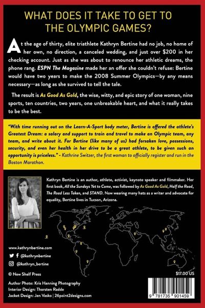 Imagine George Plimpton. Except with real athletic ability. And he's a woman. And she's taken on a challenge that makes Paper Lion look like a brisk game of Go Fish. Meet Kathryn Bertine, elite triathlete, former professional figure skater, and starving artist. Just as her personal and professional dreams begin to crumble in the summer of 2006, ESPN stakes her to a dream: Take two years to make the 2008 summer Olympics in Beijing. As Good As Gold is the heroic, hilarious account of Bertine's serial exertions in the realms of triathlon, modern pentathlon, team handball, track cycling, road cycling, rowing, open water swimming, racewalking, and-fasten your seatbelts-luge. On her journey, the obstacles range from jet lag to jellyfish, flat tires to floundering relationships, repeated rejection to road rash. But, as time is running out, Bertine doesn't sweat the small stuff, only the large-like scouring the globe for a tiny nation to adopt her, and pushing her body and mind as far as it will go. Maybe all the way to China. Between harrowing, often laugh-out-loud episodes of triumph and humiliation, Bertine takes short "Water Breaks" to contemplate the ins-and-outs of fan mail, failure, rehydration, nasal reconstruction, and how best to punish steroid users. Kathryn Bertine swims, runs, and rides-and writes-like a champion. In As Good as Gold, Bertine proves she has something more valuable than an Olympic medal. She's got Olympic mettle. When it comes to the human heart, she takes the gold.