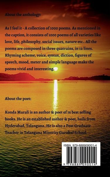 As I feel it- A collection of 1000 poems is an anthology. As mentioned in the caption, it consists of 1000 poems of all varieties like love, life, philosophy, social issues, nature etc.. All the poems are composed in three quatrains, in 12 lines. Rhyming scheme, voice, syntax, diction, figures of speech, mood, meter and simple language make the poems vivid and interesting. These can be easily sung as each line is with good rhythm. Of 1000 poems, 101 sonnets about the Indian Culture are composed. Natural feelings make the anthology very interesting. Each poem focuses on one main idea and it is visualized through appropriate words and sentences. The book definitely leaves a good impact on the readers. Without deviating from the main idea, all the poems are composed using economical usage of the words as condensed usage of words gives good sound and meaning. Some of the poems take the readers to recall their past.