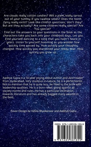 Are clouds really cotton candies? Will a plant really sprout out of your tummy if you swallow seeds? Does the tooth fairy really exist? Look like childish questions, don't they? But are they actually? Are some children really special? Are You special? Find out the answers to your questions in the book as the characters take you back into your childhood days. Let you find yourself dancing to a song that you hadn't heard in years. Listen to yourself humming as you wonder how quickly time passed by. How quickly your thoughts changed. How quickly you abandoned your teddy bear. How quickly you grew up.