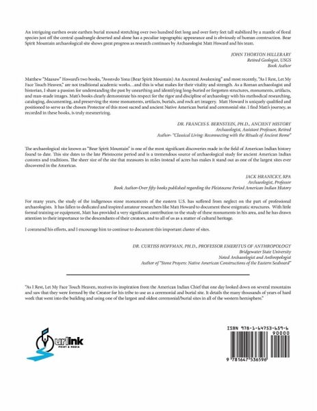 An intriguing earthen ovate earthen burial mound stretching over two hundred feet long and over forty feet tall stabilized by a mantle of floral species just off the central quadrangle deserted and alone has a peculiar topographic appearance and is obviously of human construction. Bear Spirit Mountain archaeological site shows great progress as research continues by Archaeologist Matt Howard and his team. JOHN THORTON HILLERARY Retired Geologist, USGS Book Author Matthew "Maasaw" Howard's two books, "Avonvdo Yona (Bear Spirit Mountain) An Ancestral Awakening" and most recently, "As I Rest, Let My Face Touch Heaven," are not traditional academic works...and this is what makes for their vitality and strength. As a Roman archaeologist and historian, I share a passion for understanding the past by unearthing and identifying long-buried or forgotten structures, monuments, artifacts, and man-made images. Matt's books clearly demonstrate his respect for the rigor and discipline of archaeology with his methodical researching, cataloging, documenting, and preserving the stone monuments, artifacts, burials, and rock art imagery. Matt Howard is uniquely qualified and positioned to serve as the chosen Protector of this most sacred and ancient Native American burial and ceremonial site. I find Matt's journey, as recorded in these books, is truly mesmerizing. DR. FRANCES S. BERNSTEIN, PH.D., ANCIENT HISTORY Archaeologist, Assistant Professor, Retired Author- "Classical Living: Reconnecting with the Rituals of Ancient Rome" The archaeological site known as "Bear Spirit Mountain" is one of the most significant discoveries made in the field of American Indian history found to date. This site dates to the late Pleistocene period and is a tremendous source of archaeological study for ancient American Indian customs and traditions. The sheer size of the site that measures in miles instead of acres has makes it stand out as one of the largest sites ever discovered in the Americas. JACK HRANICKY, RPA Archaeologist, Professor Book Author-Over fifty books published regarding the Pleistocene Period American Indian History For many years, the study of the indigenous stone monuments of the eastern U.S. has suffered from neglect on the part of professional archaeologists. It has fallen to dedicated and inspired amateur researchers like Matt Howard to document these enigmatic structures. With little formal training or equipment, Matt has provided a very significant contribution to the study of these monuments in his area, and he has drawn attention to their importance to the descendants of their creators, and to all of us as a matter of cultural heritage. I commend his efforts, and I encourage him to continue to document this important cluster of sites. DR. CURTISS HOFFMAN, PH.D., PROFESSOR EMERITUS OF ANTHROPOLOGY Bridgewater State University Noted Archaeologist and Anthropologist Author of "Stone Prayers: Native American Constructions of the Eastern Seaboard" ___________________________________________________________________________________________________ "As I Rest, Let My Face Touch Heaven, receives its inspiration from the American Indian Chief that one day looked down on several mountains and saw that they were formed by the Creator for his tribe to use as a ceremonial and burial site. It details the many thousands of years of hard work that went into the building and using one of the largest and oldest ceremonial/burial sites in all of the western hemisphere."