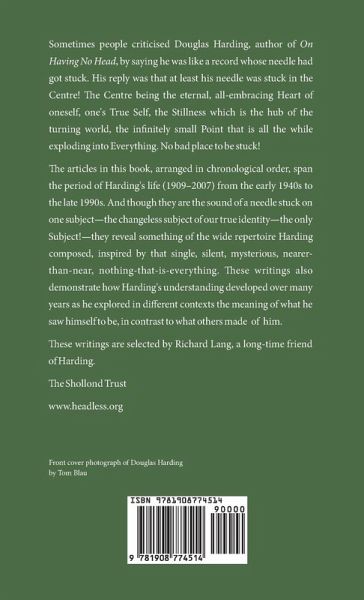Sometimes people criticised Douglas Harding, author of On Having No Head, by saying he was like a record whose needle had got stuck. His reply was that at least his needle was stuck in the Centre! The Centre being the eternal, all-embracing Heart of oneself, one’s True Self, the Stillness which is the hub of the turning world, the infinitely small Point that is all the while exploding into Everything. No bad place to be stuck! The articles in this book, arranged in chronological order, span the period of Harding’s life (1909–2007) from the early 1940s to the late 1990s. And though they are the sound of a needle stuck on one subject—the changeless subject of our true identity—the only Subject!—they reveal something of the wide repertoire Harding composed, inspired by that single, silent, mysterious, nearer-than-near, nothing-that-is-everything. These writings also demonstrate how Harding’s understanding developed over many years as he explored in different contexts the meaning of what he saw himself to be, in contrast to what others made of him. These writings are selected by Richard Lang, a long-time friend of Harding’s.