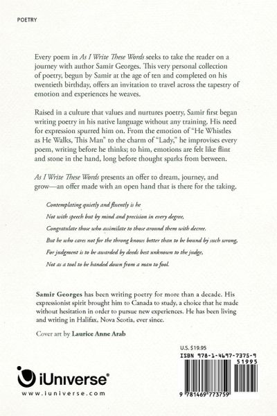 Every poem in As I Write These Words seeks to take the reader on a journey with author Samir Georges. This very personal collection of poetry, begun by Samir at the age of ten and completed on his twentieth birthday, offers an invitation to travel across the tapestry of emotion and experiences he weaves. Raised in a culture that values and nurtures poetry, Samir first began writing poetry in his native language without any training. His need for expression spurred him on. From the emotion of "He Whistles as He Walks, This Man" to the charm of "Lady," he improvises every poem, writing before he thinks; to him, emotions are felt like flint and stone in the hand, long before thought sparks from between. As I Write These Words presents an offer to dream, journey, and grow-an offer made with an open hand that is there for the taking. Contemplating quietly and fluently is he Not with speech but by mind and precision in every degree, Congratulate those who assimilate to those around them with decree. But he who cares not for the throng knows better than to be bound by such wrong, For judgment is to be awarded by deeds best unknown to the judge, Not as a tool to be handed down from a man to fool.