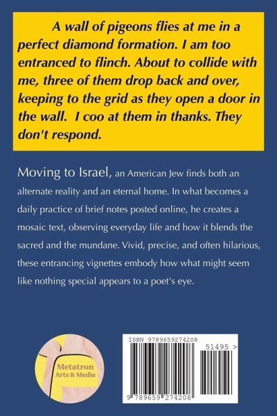 Moving to Israel, an American Jew finds both an alternate reality and an eternal home. In brief notes posted online, he creates a mosaic text, observing how everyday life blends the sacred and the mundane. Vivid, precise, and often hilarious, these entrancing vignettes embody how what might seem like nothing special appears to a poet's eye.