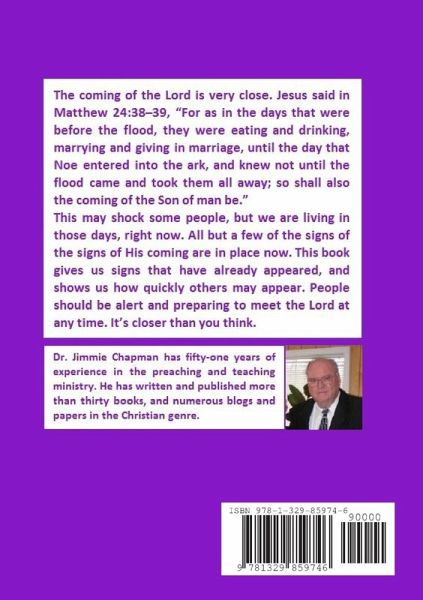 The coming of the Lord is very close. Jesus said in Matthew 24:38-39, "For as in the days that were before the flood they were eating and drinking, marrying and giving in marriage, until the day that Noe entered into the ark, And knew not until the flood came, and took them all away; so shall also the coming of the Son of man be." It may be shocking to many people, but we are living in those days right now. All but a very few of the signs of His coming are in place now. This book gives us the signs that have already appeared and shows how quickly others may appear. People should be alert and preparing to meet the Lord at any time. It is closer than you think.