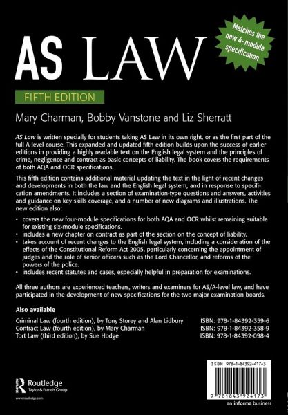 This latest edition of AS Law has been fully updated to meet the requirements of the most recent changes to the specifications of both AQA and OCR examination boards. This title is tailored to the NEW four-module specifications for both AQA and OCR (although also suitable for the existing six-module specifications) includes a new chapter on Contract as part of the section on The Concept of Liability contains coverage of recent legal changes includes the effects of the Constitutional Reform Act 2005, especially concerning appointment of judges and the role of senior officers, such as the Lord Chancellor; reform of the powers of the police; recent statutes and cases particularly useful in preparing for questions involving judicial precedent and statutory interpretation. is written by authors who are experienced teachers, writers and examiners for AS/A-level law.