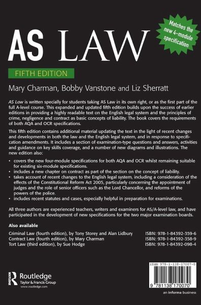 This latest edition of AS Law has been fully updated to meet the requirements of the most recent changes to the specifications of both AQA and OCR examination boards.