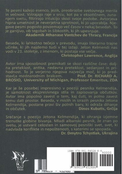JETON KELMENDI, pesnik, dramatik, publicist, prevaja- lec, zalönik ter univerzitetni profesor in akademik. Rojen v mestu Peja, Kosovo (1978), kon¿al osnovno ¿olo v rojstnem kraju. Kasneje nadaljeval ¿tudij na Pri¿tin- ski univerzi in diplomiral iz mnöui¿nih komunikacij. Po- diplomsko izobräevanje je kon¿al na Svobodni univerzi v Bruslju, kjer se je specializiral v mednarodnih in varst- venih ¿tudijah. Drugi magisterij je pridobil iz diplomaci- je. Kelmendi je naredil doktorat iz "vpliva medijev na politi¿no varnostna vpräanja EU". Trenutno je profesor na AAB univerzi. Je aktiven ¿lan Evropske Akademije znanosti in umetnosti v Salzburgu v Austriji. Trenutno ¿ivi in dela v Bruslju v Belgiji in v Pri¿tini na Kosovu.