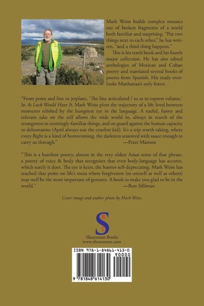 "This is a barefoot poetry, almost in the very oldest Asian sense of that phrase, a poetry of voice & body that recognizes that even body-language has accents, which surely it does. The eye is keen, the humor self-deprecating. Mark Weiss has reached that point on life's mesa where forgiveness (to oneself as well as others) may well be the most important of gestures. A book to make you glad to be in the world." -Ron Silliman