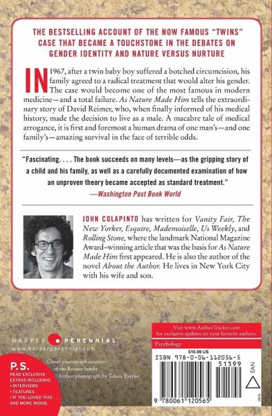 NEW YORK TIMES BESTSELLER "We should aspire to Colapinto's stellar journalist example: listening carefully to the circumstances of those who are different rather than demanding that they conform to our own." --Washington Post The true story about the "twins case" and a riveting exploration of medical arrogance, misguided science, societal confusion, gender differences, and one man's ultimate triumph In 1967, after a twin baby boy suffered a botched circumcision, his family agreed to a radical treatment that would alter his gender. The case would become one of the most famous in modern medicine--and a total failure. The boy's uninjured brother, raised as a boy, provided to the experiment the perfect matched control. As Nature Made Him tells the extraordinary story of David Reimer, who, when finally informed of his medical history, made the decision to live as a male. Writing with uncommon intelligence, insight, and compassion, John Colapinto sets the historical and medical context for the case, exposing the thirty-year-long scientific feud between Dr. John Money and his fellow sex researcher, Dr. Milton Diamond--a rivalry over the nature/nurture debate whose very bitterness finally brought the truth to light. A macabre tale of medical arrogance, it is first and foremost a human drama of one man's--and one family's--amazing survival in the face of terrible odds.