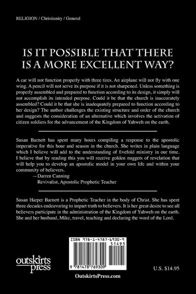 A car will not function properly with three tires. An airplane will not fly with one wing. A pencil will not serve its purpose if it is not sharpened. Unless something is properly assembled and prepared to function according to its design, it simply will not accomplish its intended purpose. Could it be that the church is inaccurately assembled? Could it be that she is inadequately prepared to function according to her design? The author challenges the existing structure and order of the church and suggests the consideration of an alternative which involves the activation of citizen soldiers for the advancement of the Kingdom of Yahweh on the earth. Susan Barnett has spent many hours compiling a response to the apostolic imperative for this hour and season in the church. She writes in plain language which I believe will add to the understanding of fivefold ministry in our time. I believe that by reading this you will receive golden nuggets of revelation that will help you to develop an apostolic model in your own life and within your community of believers. -Darren Canning, Revivalist, Apostolic Prophetic Teacher