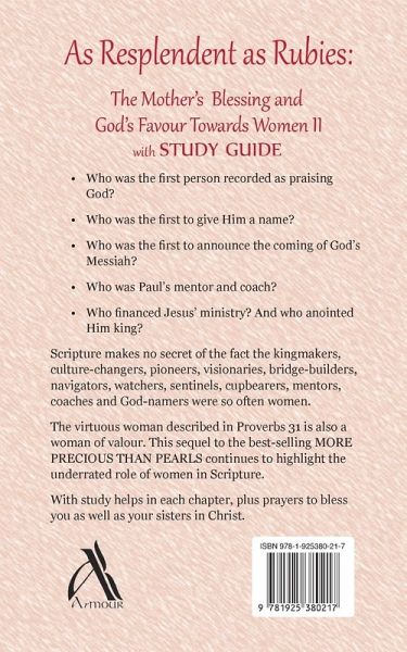 Who was the first person recorded as praising God? Who was the first to give Him a name? Who was the first to announce the coming of God's Messiah? Who was Paul's mentor and coach? Who financed Jesus' ministry? And who anointed Him king? Scripture makes no secret of the fact the kingmakers, culture-changers, pioneers, visionaries, bridge-builders, navigators, watchers, sentinels, cupbearers, mentors, coaches and God-namers were so often women. The virtuous woman described in Proverbs 31 is also a woman of valour. This sequel to the best-selling MORE PRECIOUS THAN PEARLS continues to highlight the underrated role of women in Scripture. With study helps in each chapter, plus prayers to bless you as well as your sisters in Christ.