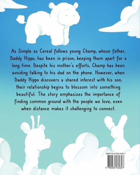Champ hasn't seen his father in a long time because Daddy Hippo has been in prison. No matter how hard Mommy Hippo tries, she can't get Champ to chat with his dad on the phone. Most of the time, he can't wait for the conversation to end. Until Daddy Hippo finally finds a hobby he has in common with his son and their relationship blossoms into something beautiful. As Simple As Cereal is a story all about sharing something special with the people you love. Sometimes distance can make it difficult to connect with our loved ones. When you're not there with them every day, you miss out on a lot of the big moments. But if you love someone enough, you will always find something to talk about, even if it's something as simple as cereal.