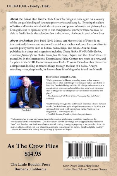 Don Baird's As the Crow Flies brings us once again on a journey of the unique blending of Japanese poetry styles and kung fu. By using the allure of haiku and hokku mixed with the elegance and power of martial art philosophies, Don guides us to open our eyes to our own, personal journeys where we may be able to finally live in the splendor that is the richest, vital core in each of our lives.