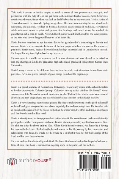 This book is meant to inspire people, to teach a lesson of how perseverance, true grit, and persistence with the help of God can get them to the ultimate level of success. Kevin Crowe is a multitalented overachiever when you look at the life obstacles he has overcome. He is a native of Texas who moved to Colorado Springs at age three. He came from nothing; he was abandoned, unwanted, and unloved. He slept on floors as homeless people stayed at his house. He watched adults who were meant to guide and protect him do drugs, and, much worse, he watched his grandfather stab a man to death. Never did he think he would find himself in the same position as the man who lay on the ground later on in his adult life. Kevin became homeless at age fourteen due to his grandmother's overdosing on heroin and cocaine. Kevin is a rare statistic; he is one of the few people who beat the system. He was never put into a foster home, because he would run; he slept on streets and in Laundromats instead. He forged his way into high school at age seventeen. He was never in a stable environment until he was nineteen and was blessed to be asked to join the Thompson family. He graduated high school and graduated college from Kansas State University. Kevin's story is meant to let all know they can beat the odds; their situations do not limit their potential. Kevin is a prime example of great things from humble beginnings.
