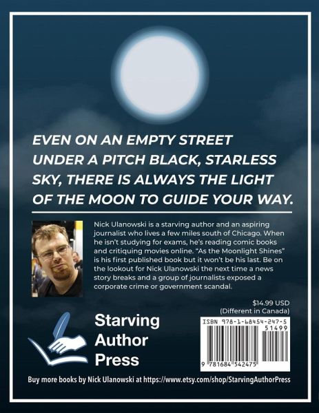 As the Moonlight Shines is a book of 94 poems by Nick Ulanowski. On the inside of the book, Jorge Santiago Jr., the cover artist, illustrated the poem "Raindrops" with a black-and-white drawing. Kristin Palmer illustrated the poem "Garlic Soup for the Soul" with a breathtaking watercolor painting. As the Moonlight Shines is a book about love, loss, grieving and death. It's a book about cope and hope. Because even on an empty road underneath a starless sky, there is always the light of the moon to guide your way.