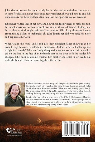 Julie Mercer donated her eggs to help her brother and sister-in-law conceive via in-vitro fertilization, never expecting a few years later, she would have to take full responsibility for those children after they lose their parents in a car accident. Julie never wanted kids of her own, and now she suddenly needs to make room in her small apartment for four-year-old twins who thrust additional challenges at her as they work through their grief and trauma. With Lucy throwing intense tantrums and Mikey not talking at all, Julie doubts her ability to raise her niece and nephew as her own. When Grant, the twins' uncle-and also their biological father-shows up at her door, he says he wants to help, but is he sincere? Or does he have a hidden agenda to fight for custody? With her family also questioning her role as guardian and her job on the line in the face of an inflexible boss as she deals with the sudden life changes, Julie must determine whether her brother and sister-in-law really did make the best decision by entrusting their kids to her.