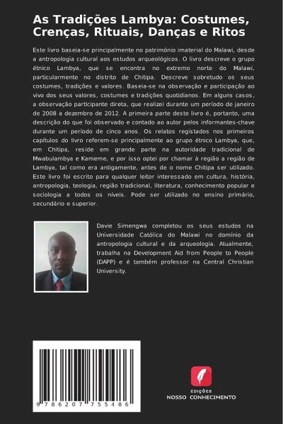 Este livro baseia-se principalmente no património imaterial do Malawi, desde a antropologia cultural aos estudos arqueológicos. O livro descreve o grupo étnico Lambya, que se encontra no extremo norte do Malawi, particularmente no distrito de Chitipa. Descreve sobretudo os seus costumes, tradições e valores. Baseia-se na observação e participação ao vivo dos seus valores, costumes e tradições quotidianos. Em alguns casos, a observação participante direta, que realizei durante um período de janeiro de 2008 a dezembro de 2012. A primeira parte deste livro é, portanto, uma descrição do que foi observado e contado ao autor pelos informantes-chave durante um período de cinco anos. Os relatos registados nos primeiros capítulos do livro referem-se principalmente ao grupo étnico Lambya, que, em Chitipa, reside em grande parte na autoridade tradicional de Mwabulambya e Kameme, e por isso optei por chamar à região a região de Lambya, tal como era antigamente, antes de o nome Chitipa ser utilizado. Este livro foi escrito para qualquer leitor interessado em cultura, história, antropologia, teologia, região tradicional, literatura, conhecimento popular e sociologia a todos os níveis. Pode ser utilizado no ensino primário, secundário e superior.